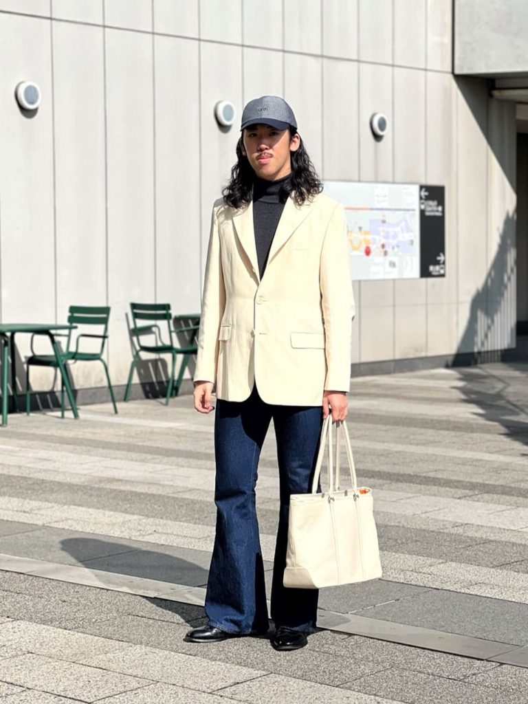 テーラードジャケットにワイドジーンズを合わせたきれいめカジュアルに、2トーンキャップを合わせて。ジャケットのきちんと感をキャップのベージュが柔らかくハズしており、30・40代にも取り入れやすい大人の抜け感コーデに仕上がっています。