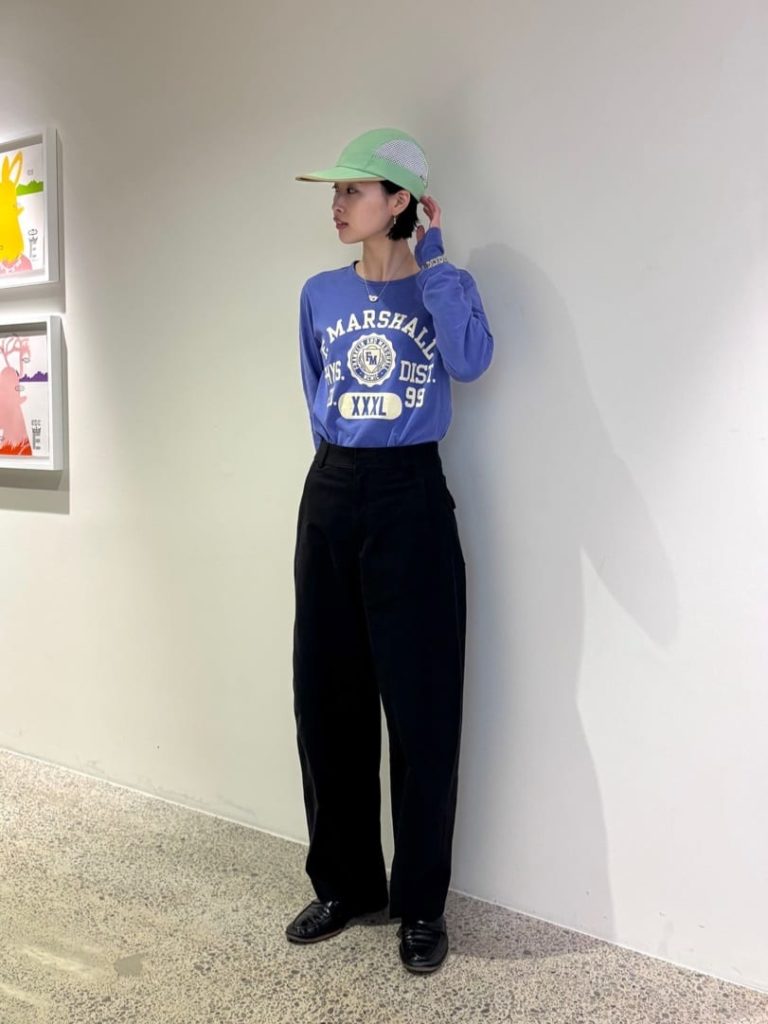 カレッジロゴのロンTに黒パンツを合わせたシンプルコーデに、メッシュキャップをオン。あえてキャップの色を浮かせることで、爽やかなアクセントが生まれています。夏のキャップ選びで迷ったら、明るいグリーンを差し色に取り入れてみて。