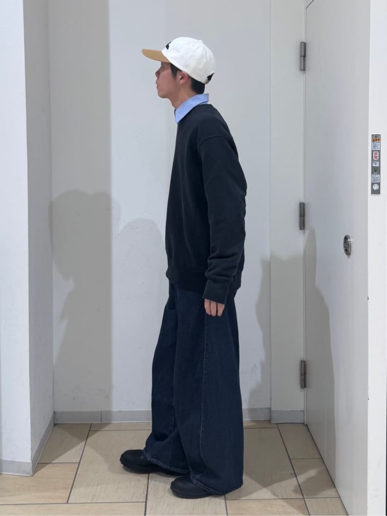 黒スウェット×ワイドデニムのダークトーンコーデに、白×ベージュバイザーのキャップを合わせたスタイル。インナーに差したライトブルーシャツが清潔感を底上げし、白キャップとリンクしています。