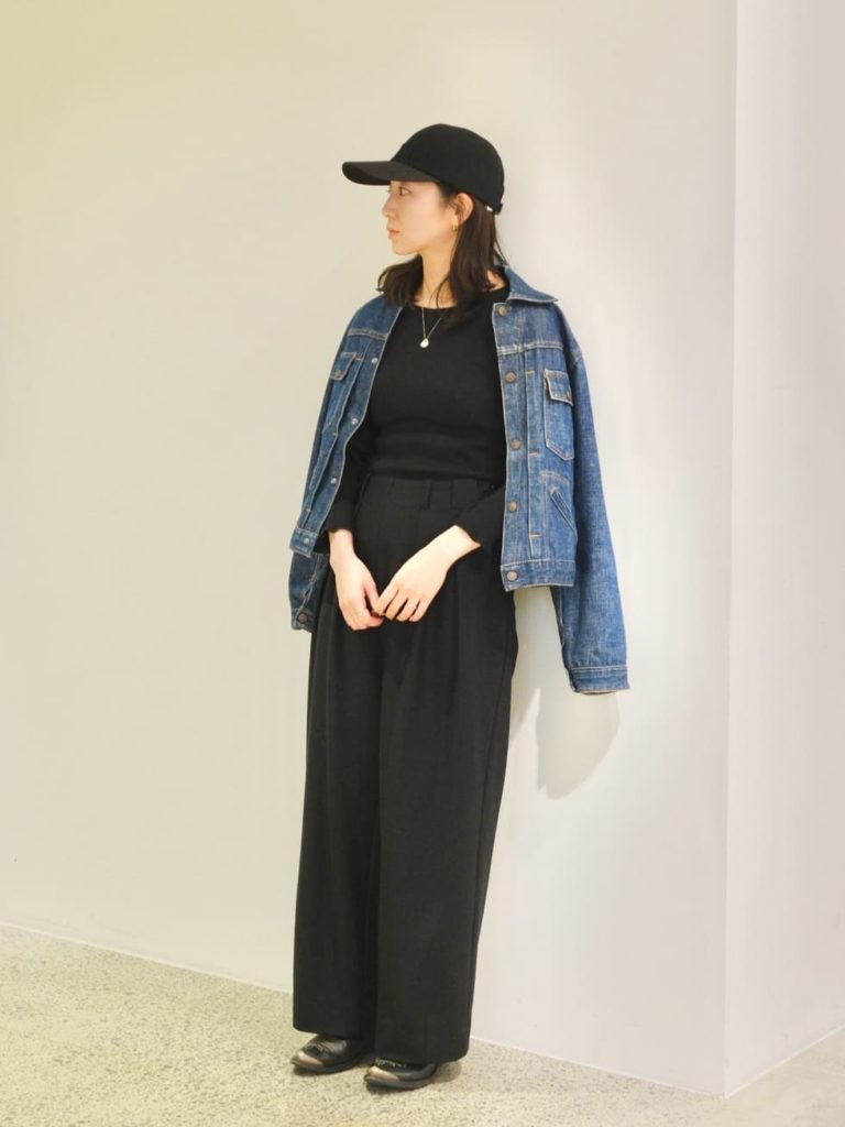 全身黒のコーデにデニムジャケットを羽織ったモードなカジュアルコーデ。帽子とシューズも同系色でまとめることで、全体の印象が崩れず洗練された雰囲気を保っています。ゴールドのネックレスで女性らしさを添えた小物使いも参考に。