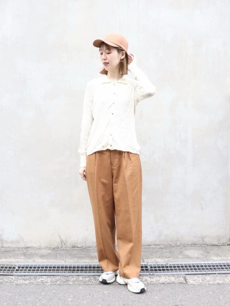 白のレースニット×キャメルのパンツと、淡色できれいめにまとめたコーデ。小物でカジュアルダウンしつつも、キャップとパンツのカラーを揃えることで、自然なまとまりが生まれています。全体の品のある色合わせがきれいめ派にぴったり。