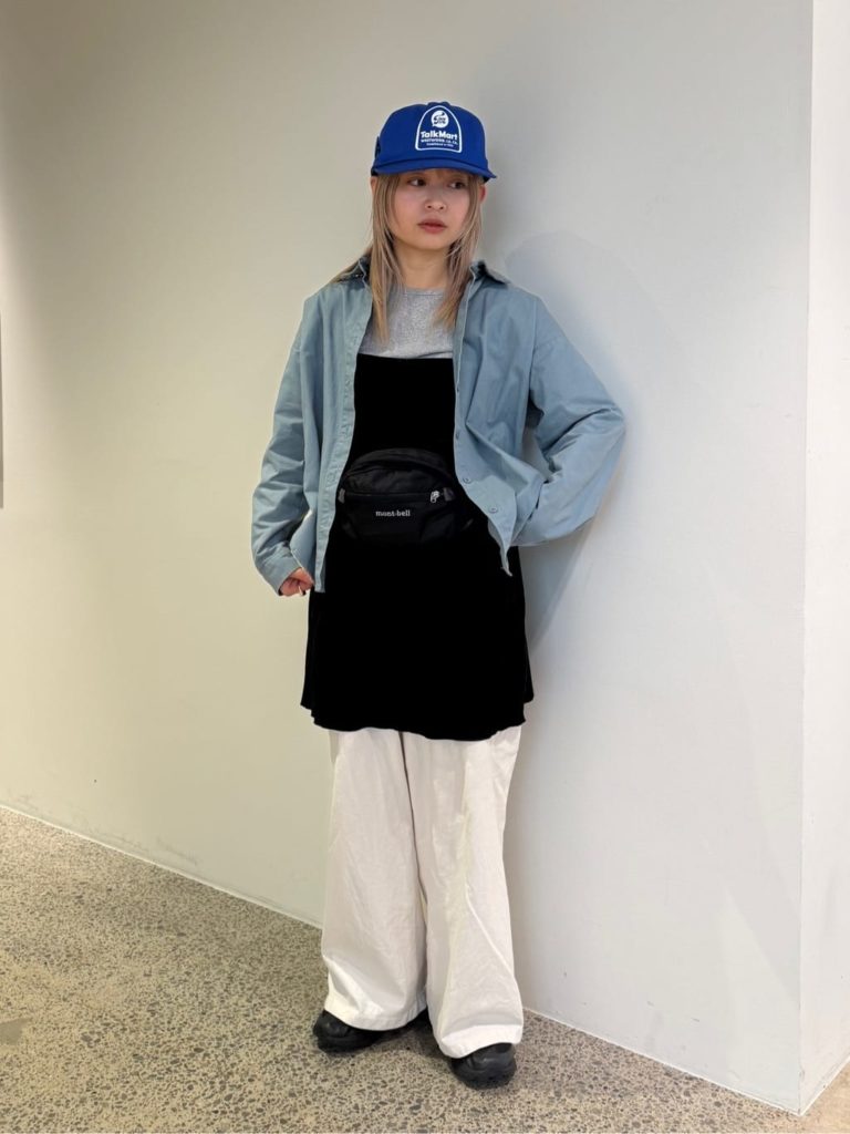 白パンツと黒ワンピ、くすみブルーのシャツを重ねたこなれ感たっぷりのレイヤードコーデ。そこに合わせた古着風キャップとウエストバッグが、絶妙なハズしとして機能しています。キャップとシャツがブルーでリンクしているのもポイント。