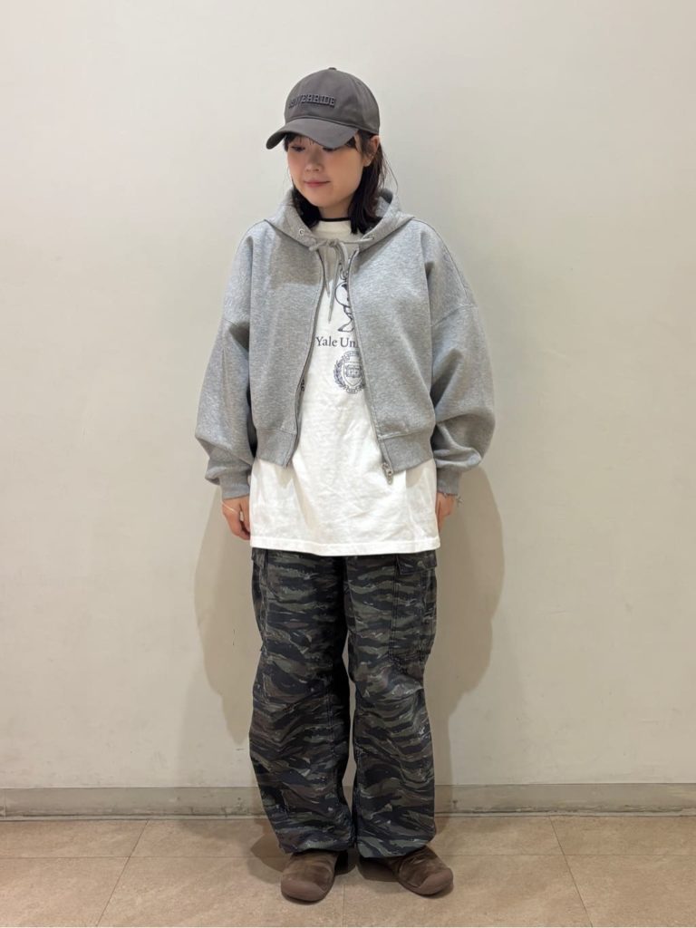 ロゴキャップにパーカー、カモフラパンツを合わせたストリートコーデ。全体のボリューム感が、平成リバイバルらしい今どきシルエットを作りつつ、グレーで揃えたキャップとクロップドパーカーで視線を上にあげています。