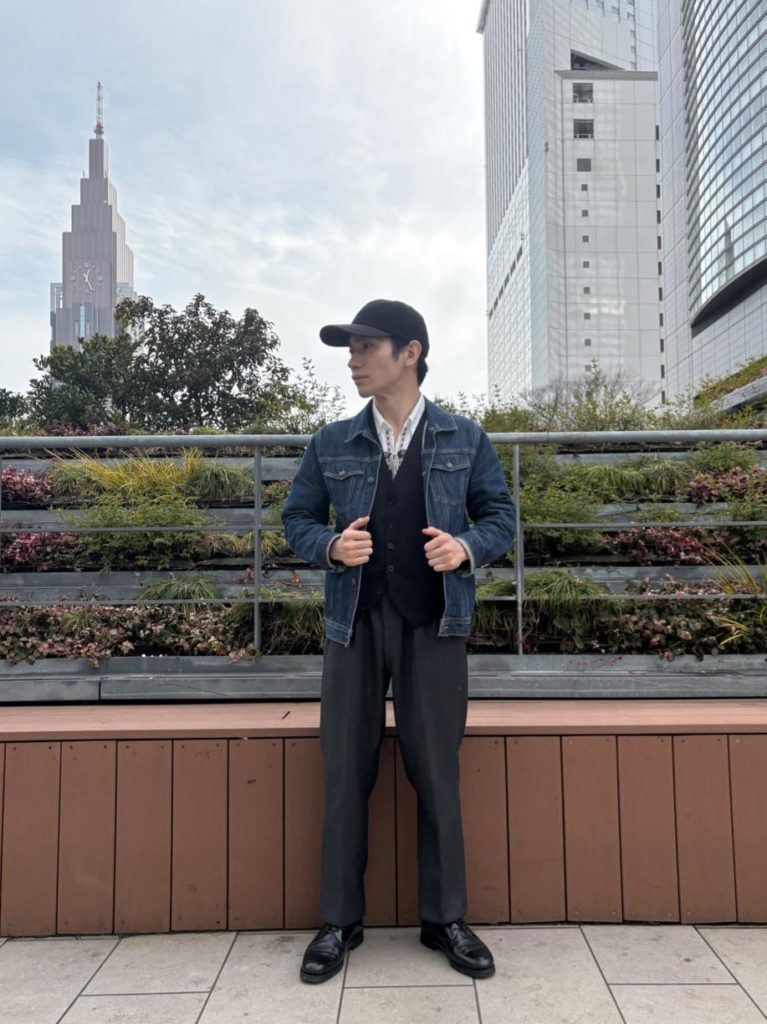 カジュアルなデニムとドレッシーなベスト・スラックスの組み合わせを、黒キャップがすっきりまとめたスタイル。革靴を合わせることできれいめな印象をキープしつつ、キャップと色を揃えて統一感を出しています。