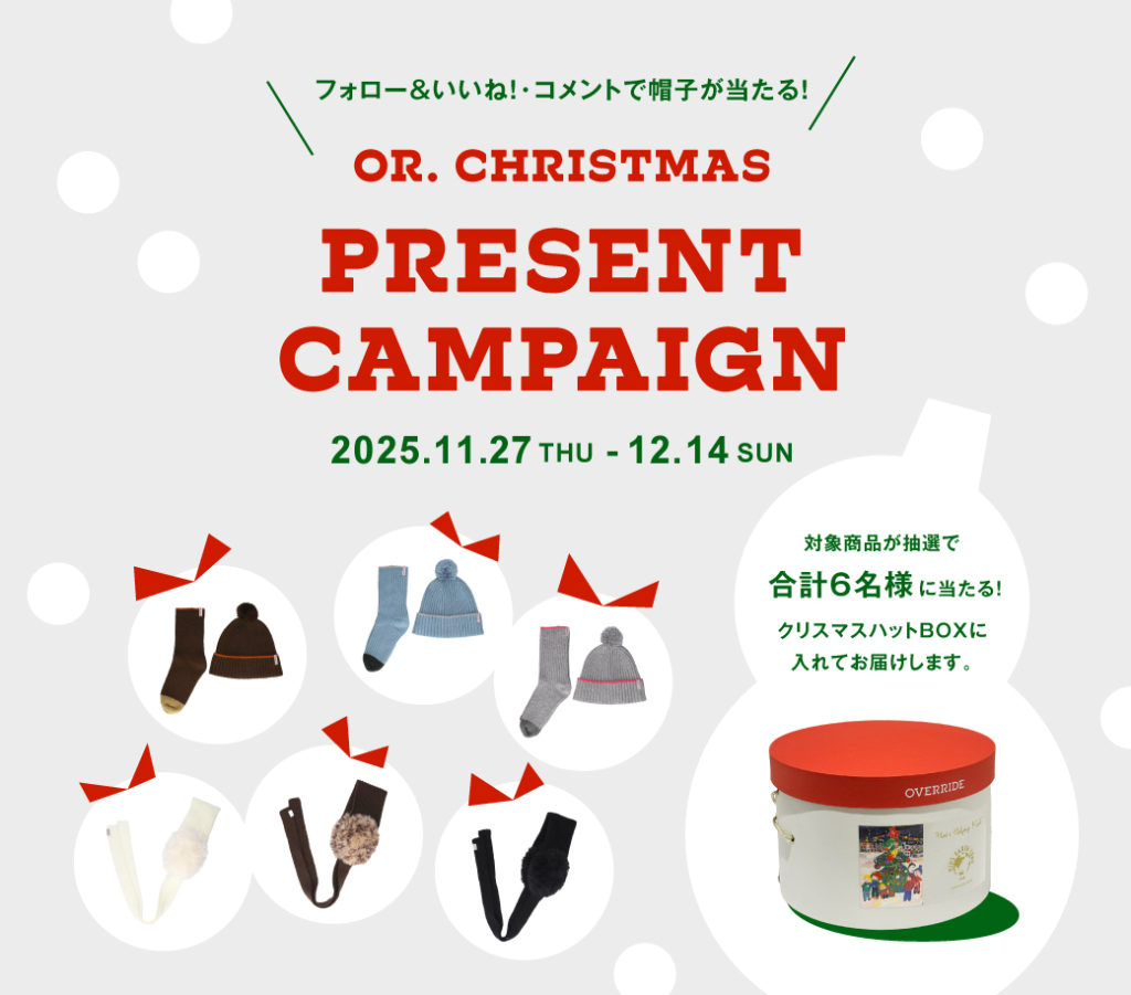 オーバーライド公式Instagramにて、クリスマスキャンペーンを開催。オーバーライドから日頃の感謝を込めて、合計6名様に帽子をプレゼントします。