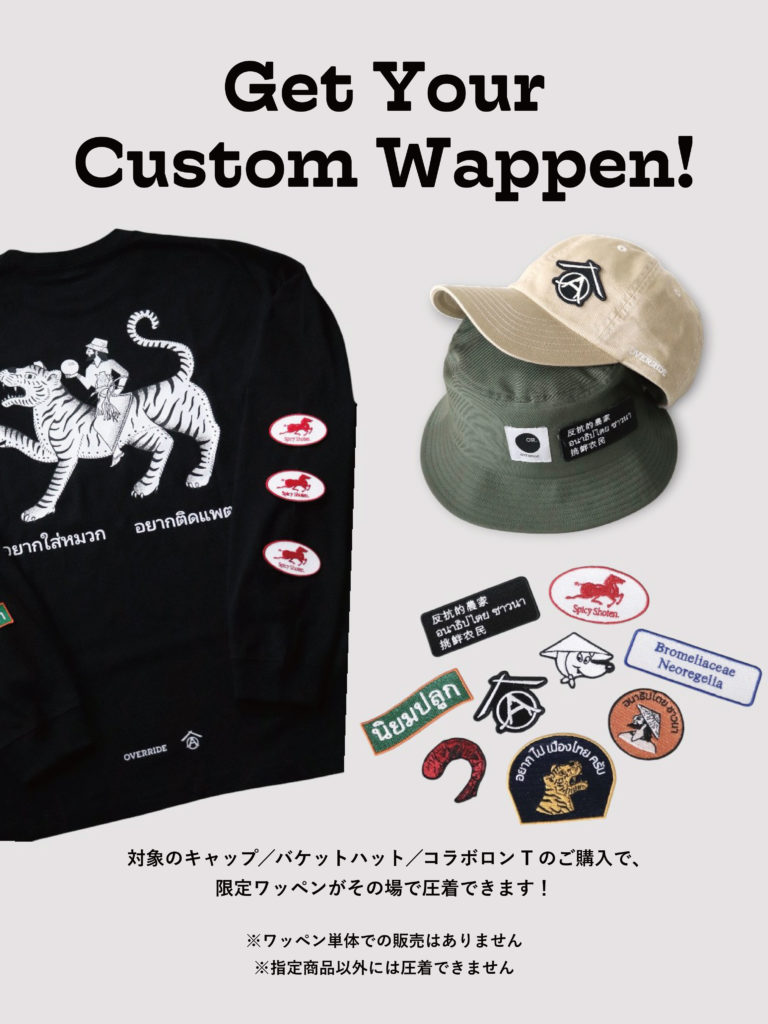 指定のOVERRIDEキャップ、バケットハット、またはコラボロンTをご購入いただいた方を対象に、イベント限定で製作した特製ワッペンを、その場で圧着できるカスタム体験を実施します。