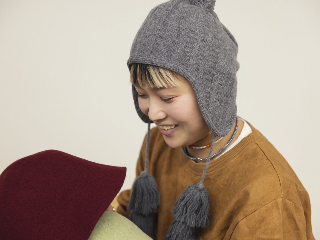 天野:素材は、ニットをしっかり縮絨したウール100%で、ウール自体の天然の特性である断熱性と防臭効果が期待できます。ウールのサウナハットでは珍しい洗濯機洗いにも対応してて。脱水してから、生地を伸ばしながら形を整えて乾かすと、少しだけサイズを大きく調整できます。