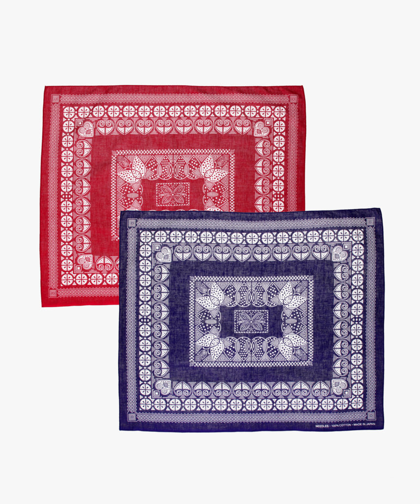 ブランドの象徴である「蝶(パピヨン)」を、小紋柄のように全体へあしらったバンダナ。ヴィンテージ感のある柄にNEEDLESらしい配色を組み合わせ、独特の「色気」と「遊び心」がプラスされています。吸水性に優れた軽やかなコットン100%素材は、使い込むほどに柔らかく肌に馴染み、自分だけのヴィンテージのような質感に育っていきます。伝統的な手ぬぐいと同じ「切りっぱなし」仕様にすることで、首元や頭に巻いた際も結び目がごろつかず、すっきりと馴染むのが特徴。日常のコーディネートにさりげないアクセントを添えてくれる一枚です。