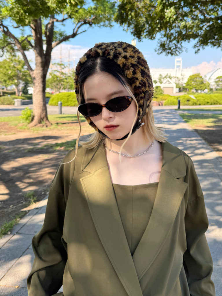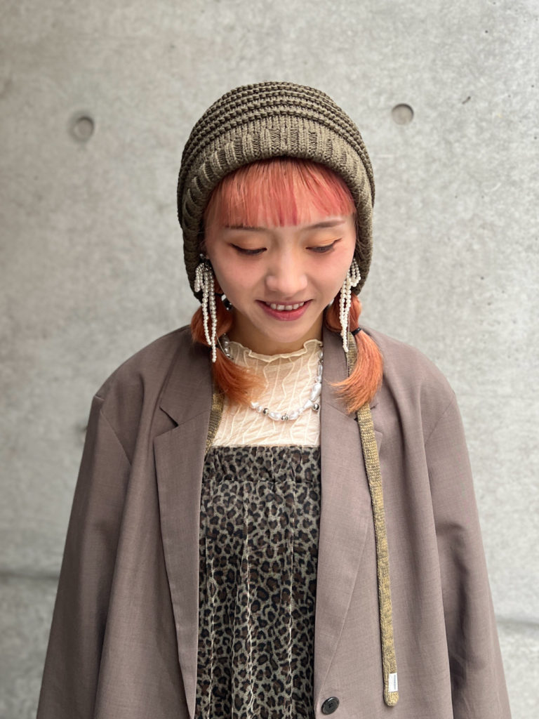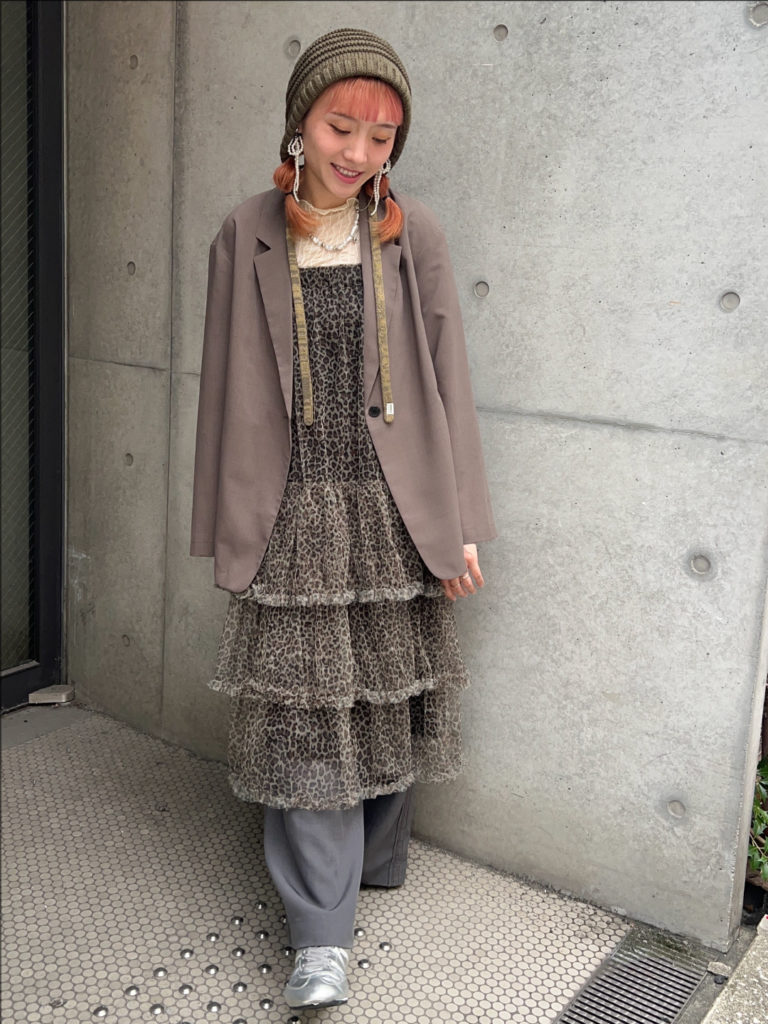 可愛い前髪をしっかり見せられるニット帽!大人っぽい雰囲気のジャケットを羽織れば、上品でスマートな印象に。インナーにはガーリーなレオパード柄のロングワンピースを取り入れ、そこにスラックスを重ねて、こなれたレイヤード感をプラスしました。帽子の紐の花柄が、シンプルなジャケットスタイルに華やかなアクセントを添えてくれます!