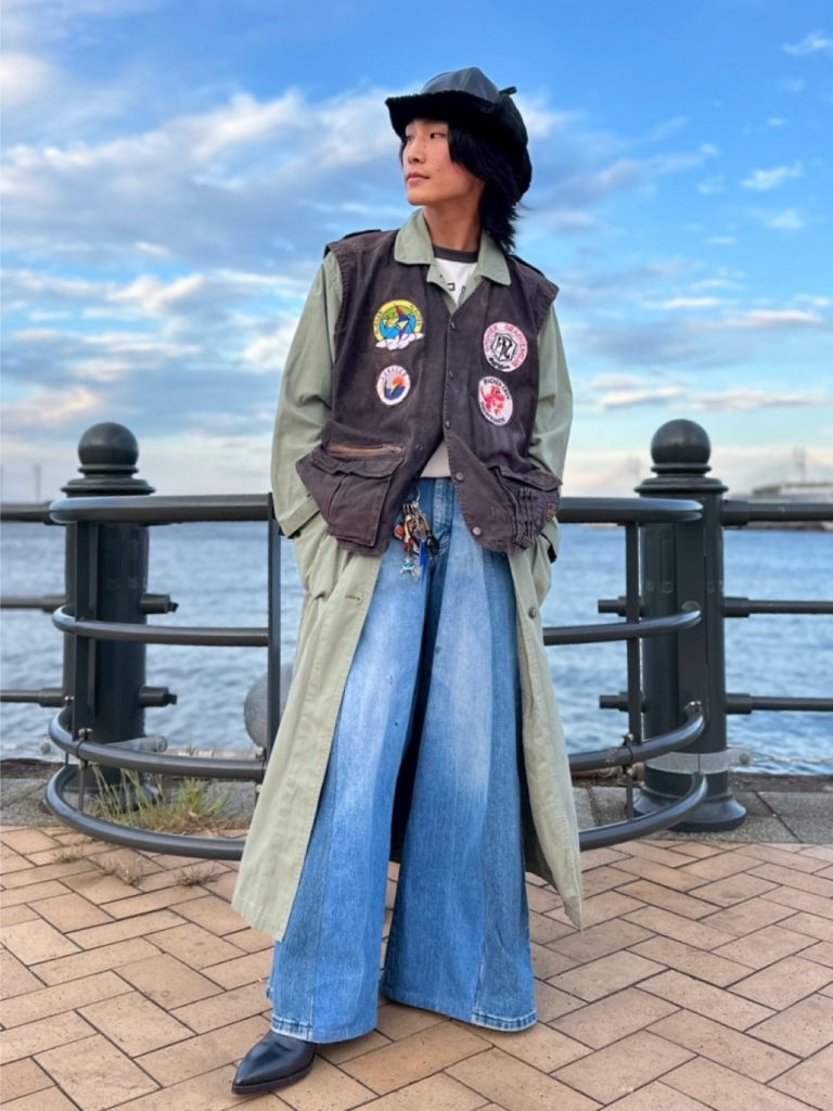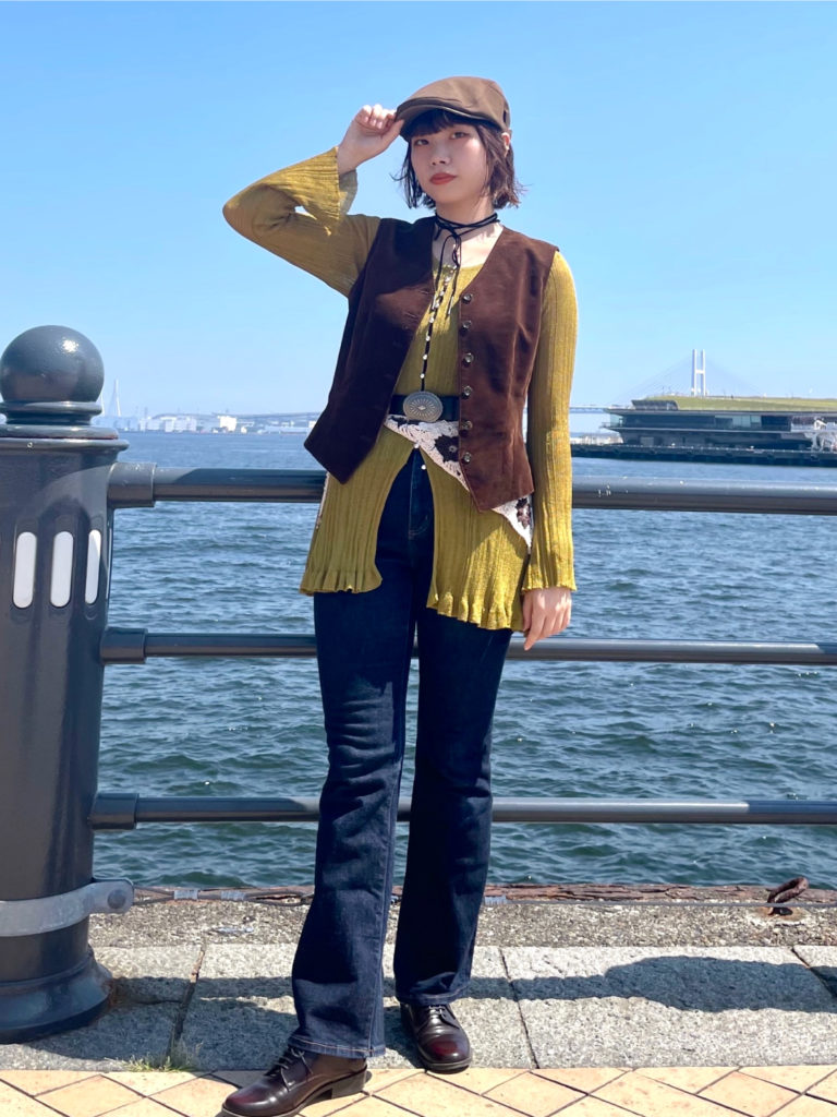 古着のコーデュロイ生地のベストを合わせたり、小物使いを工夫したりすることでウエスタン調なスタイリングを目指しました♪