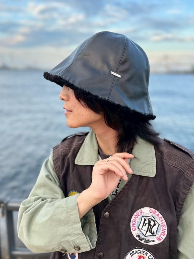可愛くもかっこよくも、形すら好きなようにアレンジできる遊びがいのあるフェイクレザーのチューリップハット。古着との組み合わせで無骨な雰囲気のあるコーディネートを組んでみました。