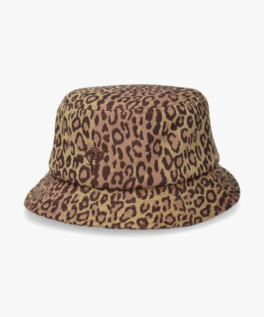 レオパード柄のポリエステルジャカード素材が目を引くバケットハット。短めのブリムとコンパクトなシルエットも特徴的です。スタイリングのアクセントとして個性を発揮するアイテムとなっています。