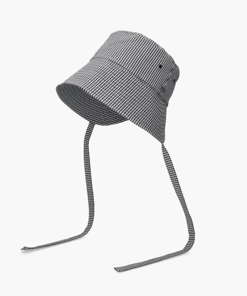 広めのつばでUVカット率90%のボンネット型ハット。さらりとした肌触りのギンガムサッカー素材で、暑い季節に嬉しい清涼感をプラスします。太めのリボンで結んだ際の安定感と存在感が演出でき、後ろが大きく開いた形状で被るだけで可愛らしいシルエットが完成。